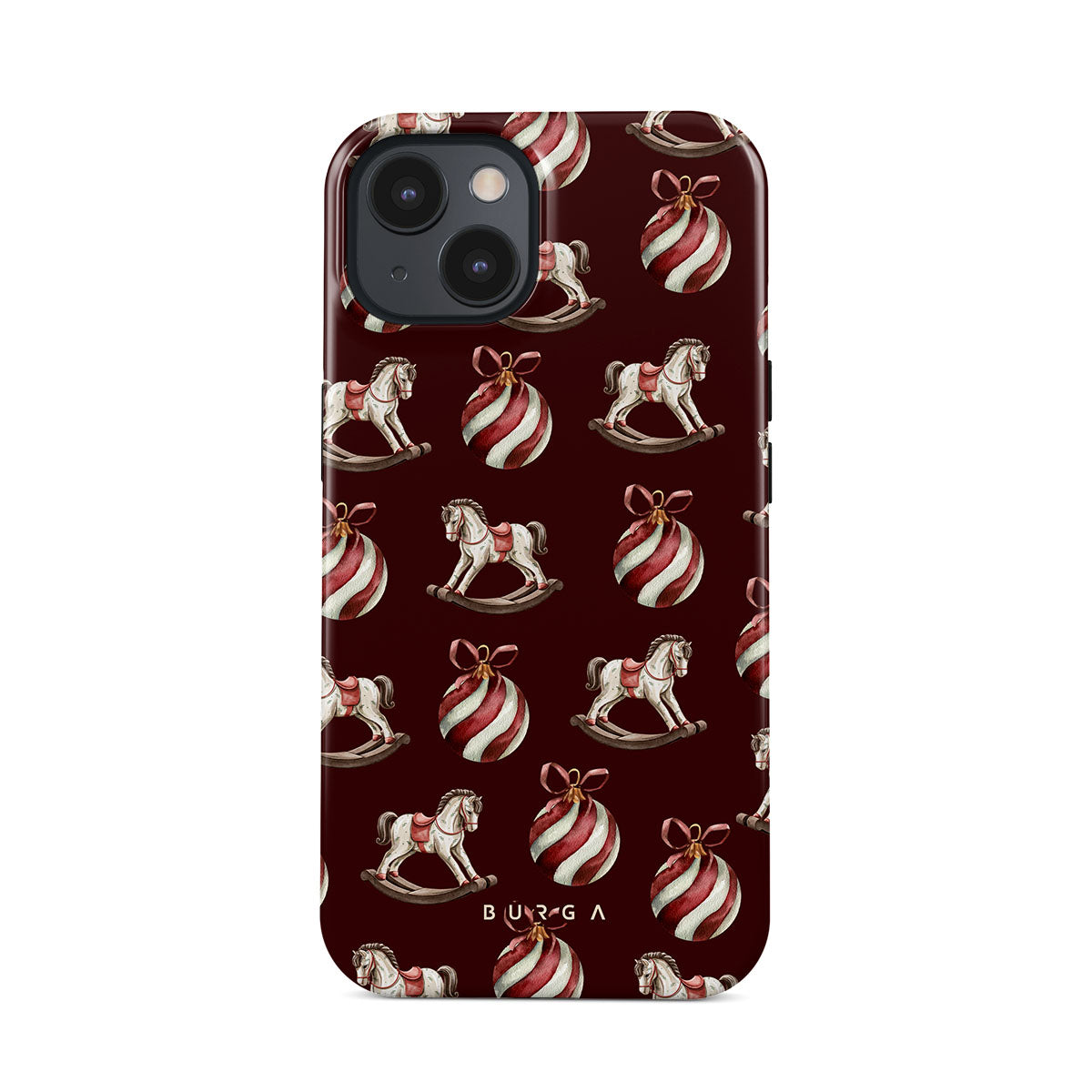 Główne elementy projektu: konie na biegunach, bombki, kolor czerwony, świąteczny wzór