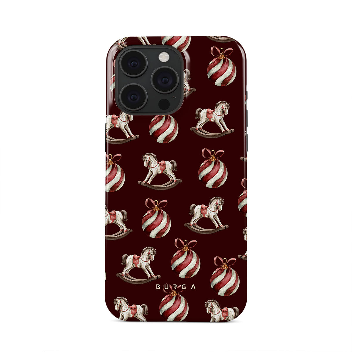 Główne elementy projektu: konie na biegunach, bombki, kolor czerwony, świąteczny wzór