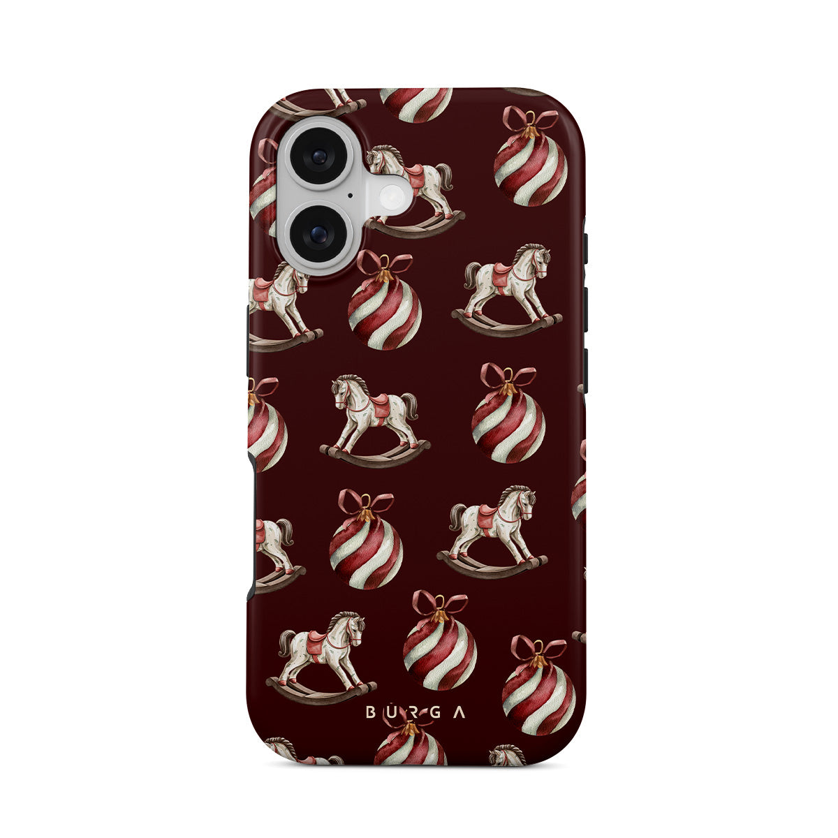 Główne elementy projektu: konie na biegunach, bombki, kolor czerwony, świąteczny wzór