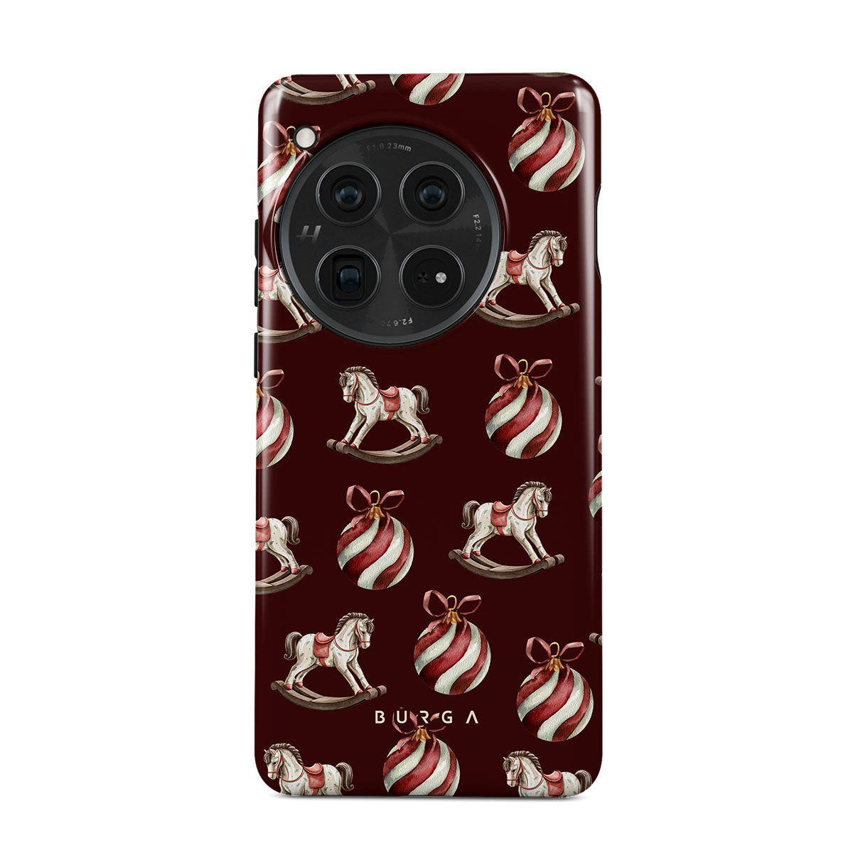 Główne elementy projektu: konie na biegunach, bombki, kolor czerwony, świąteczny wzór