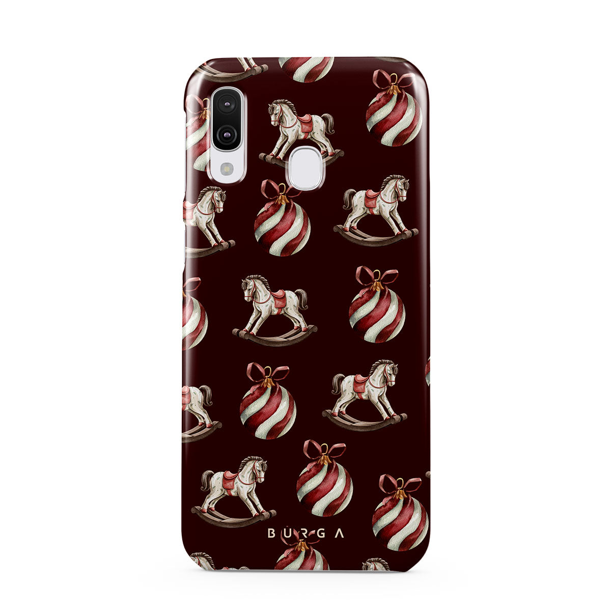 Główne elementy projektu: konie na biegunach, bombki, kolor czerwony, świąteczny wzór