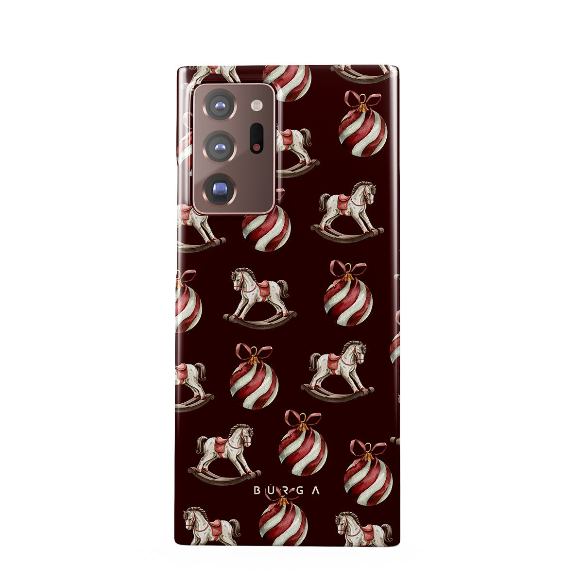 Główne elementy projektu: konie na biegunach, bombki, kolor czerwony, świąteczny wzór