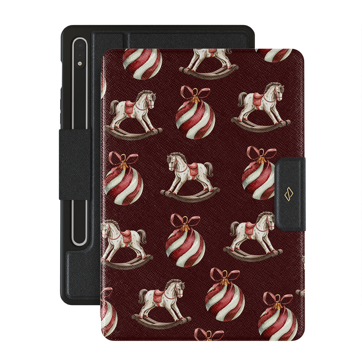 Uwaga: Wzór jest nadrukowany – nie ma faktury ani tłoczenia.Główne elementy projektu: konie na biegunach, bombki, kolor czerwony, świąteczny wzór