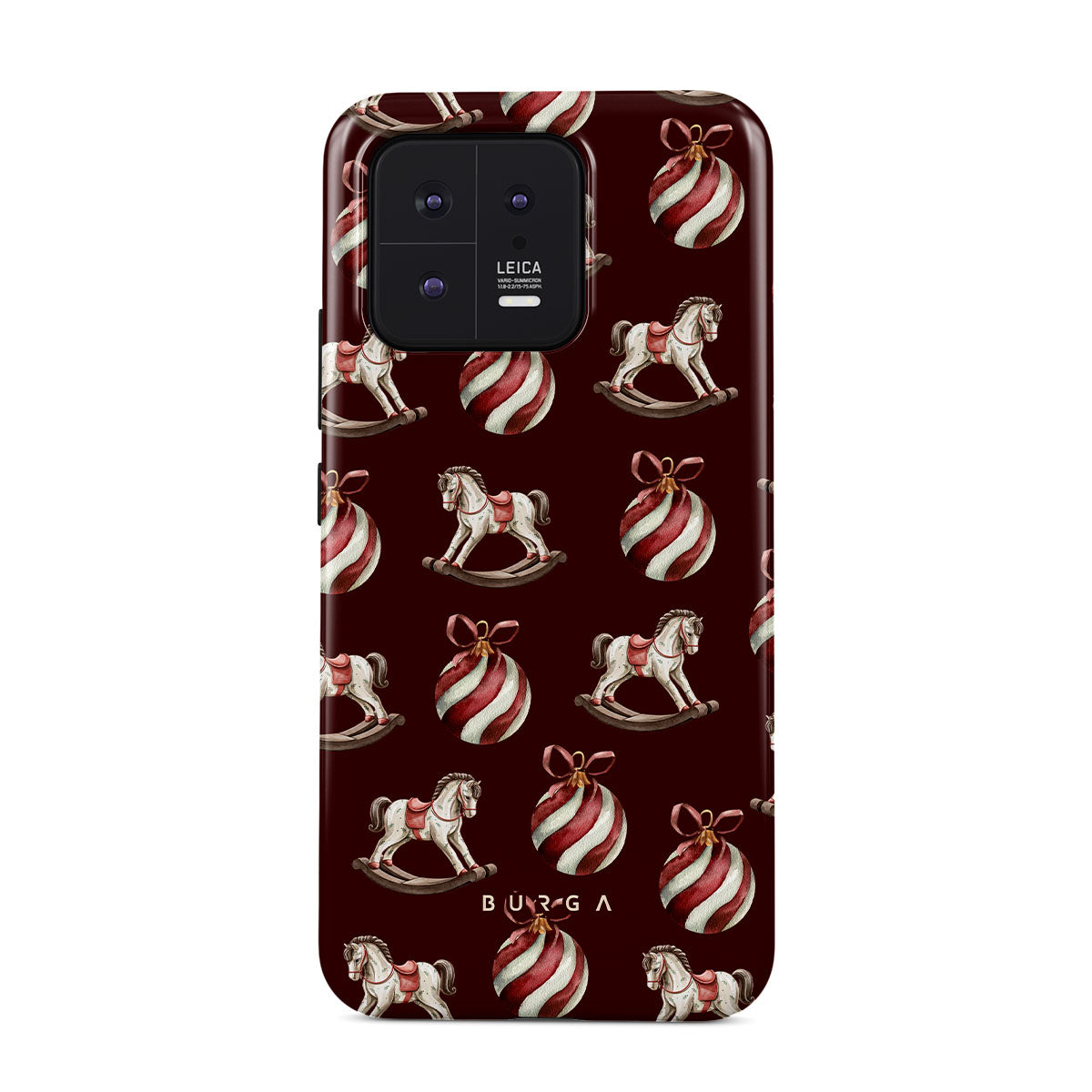 Główne elementy projektu: konie na biegunach, bombki, kolor czerwony, świąteczny wzór