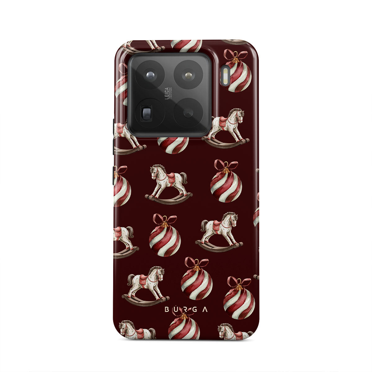 Główne elementy projektu: konie na biegunach, bombki, kolor czerwony, świąteczny wzór