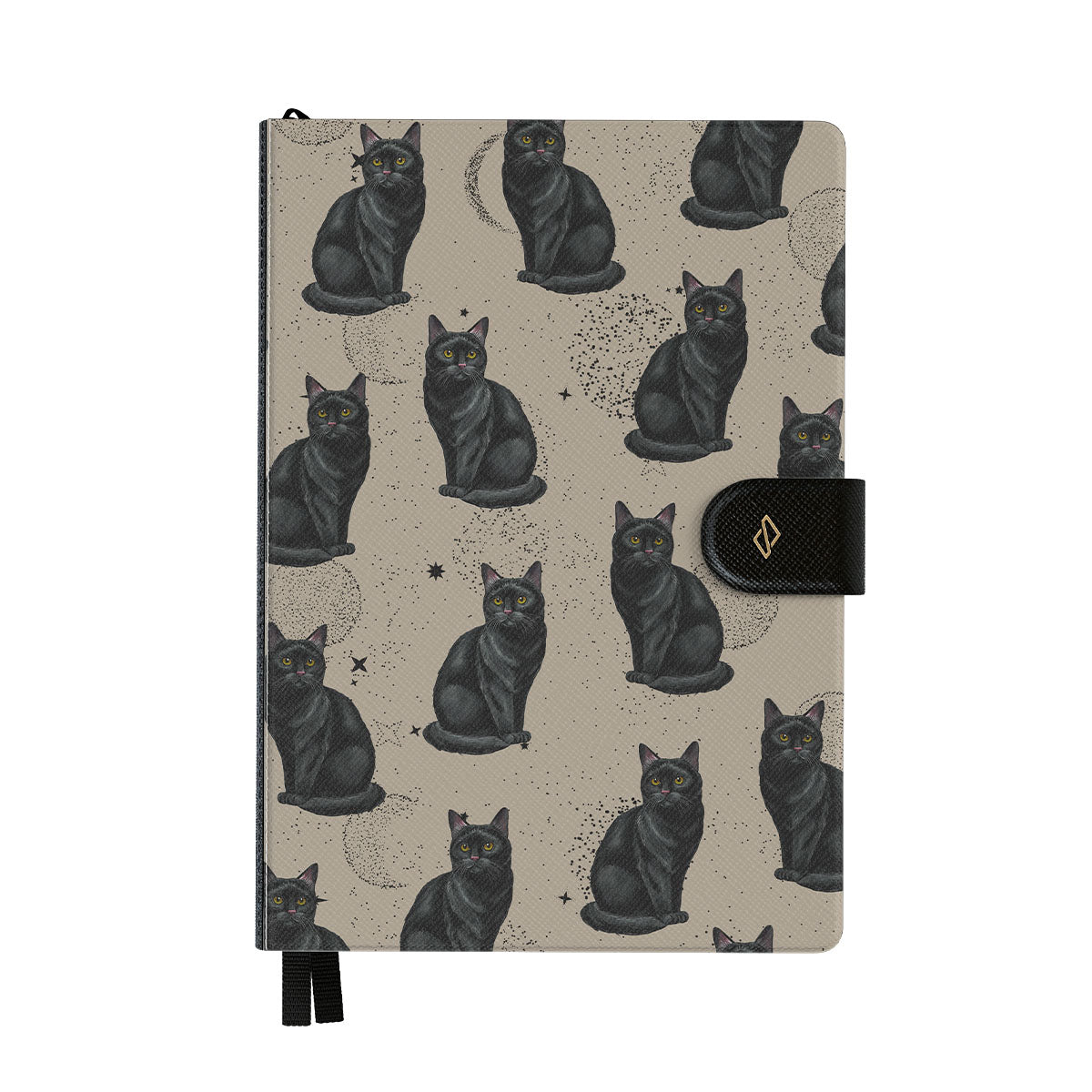 Główne elementy projektu: czarne koty, mistyczne symbole.