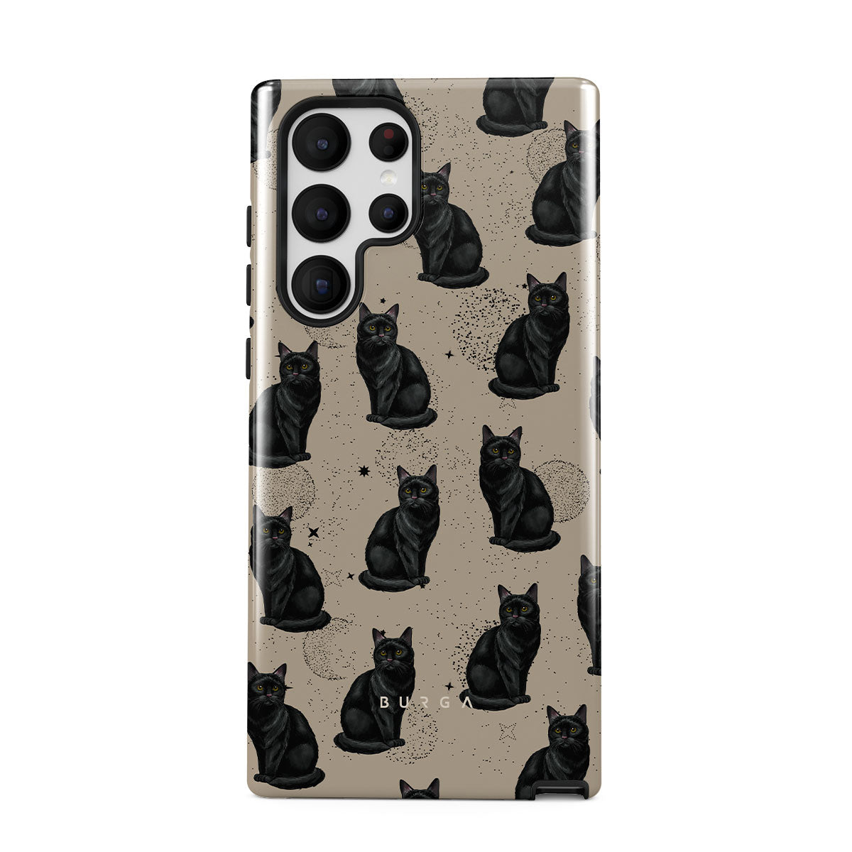 Główne elementy projektu: czarne koty, mistyczne symbole.