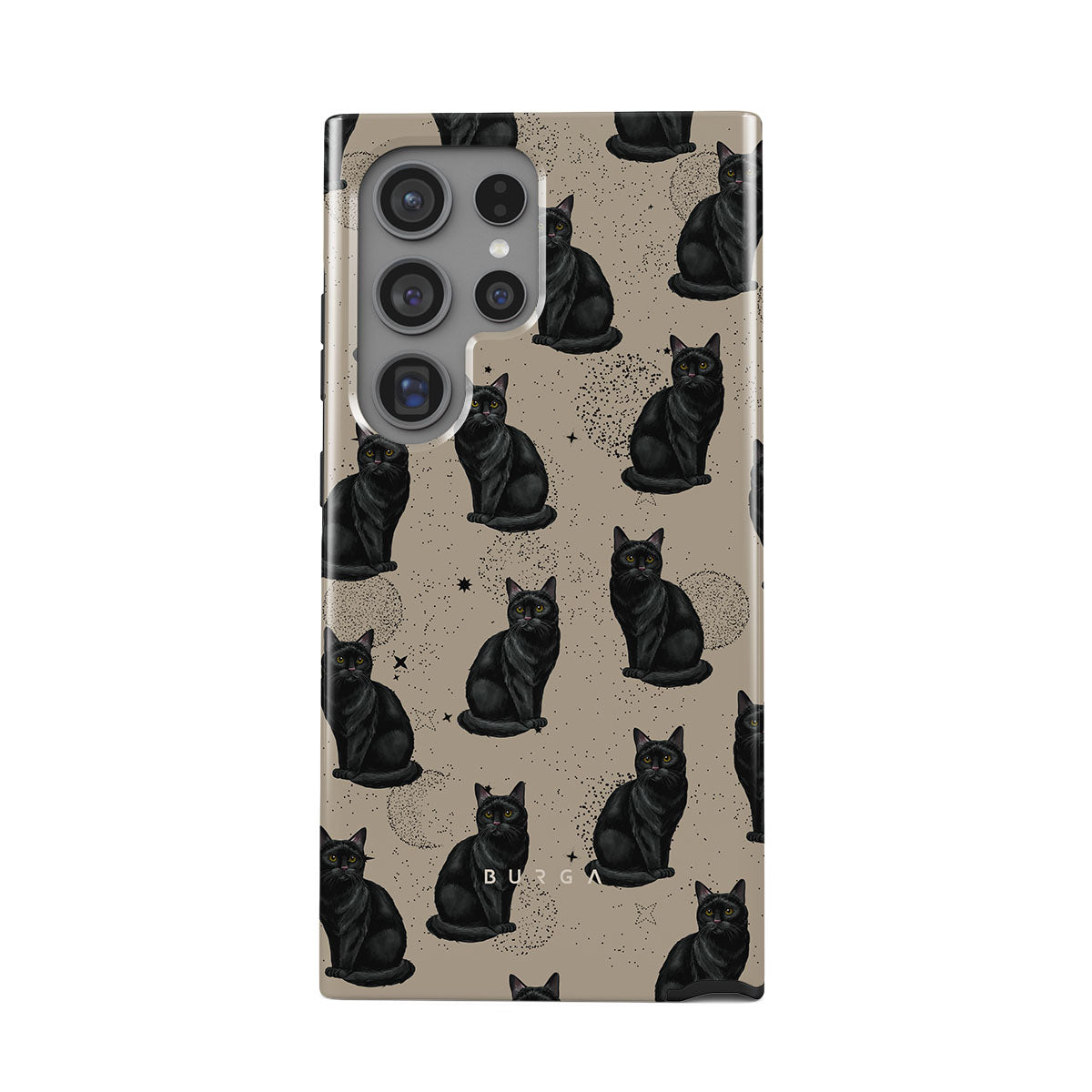 Główne elementy projektu: czarne koty, mistyczne symbole.