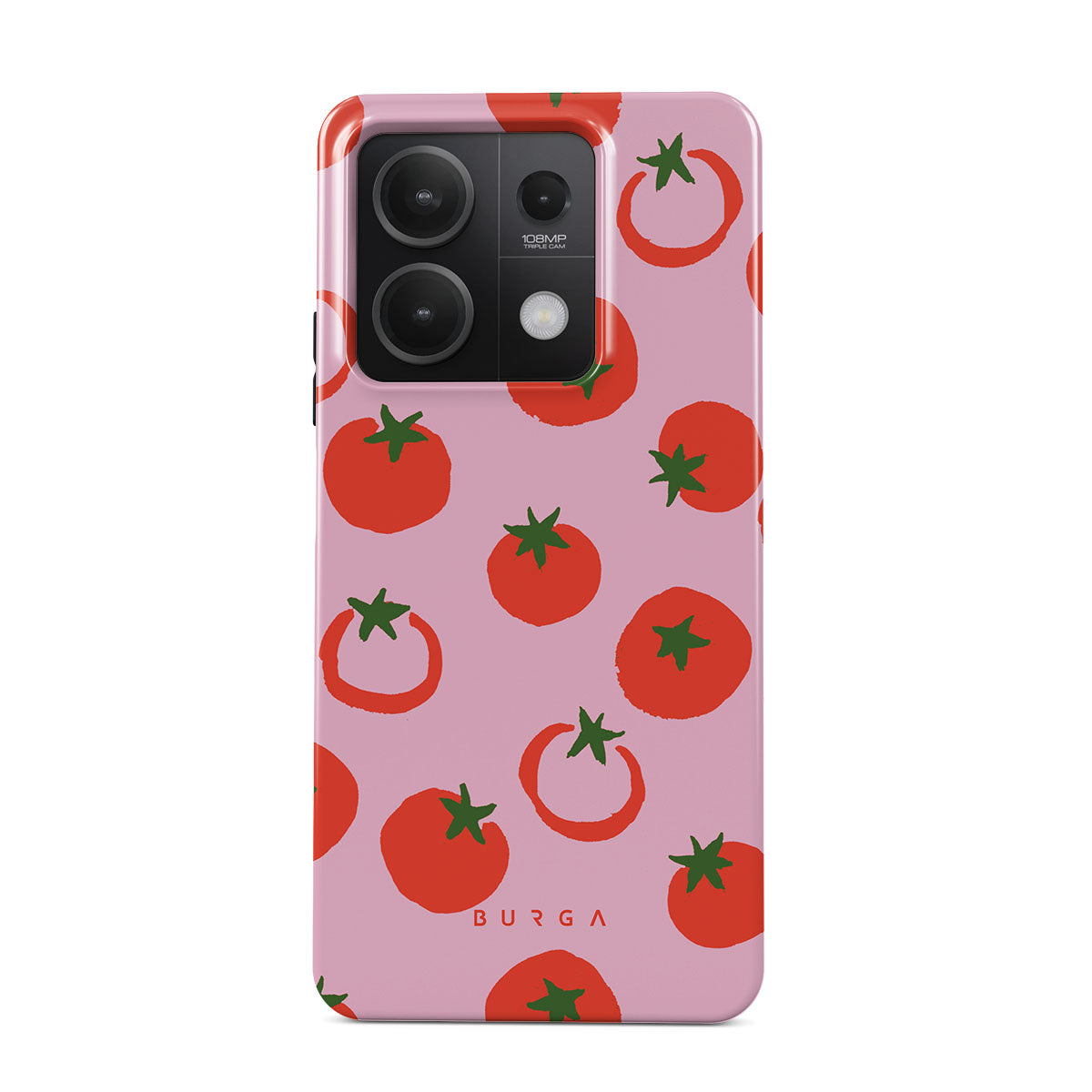 Główne elementy projektu: Pomidory, odważne czerwone i różowe kolory.