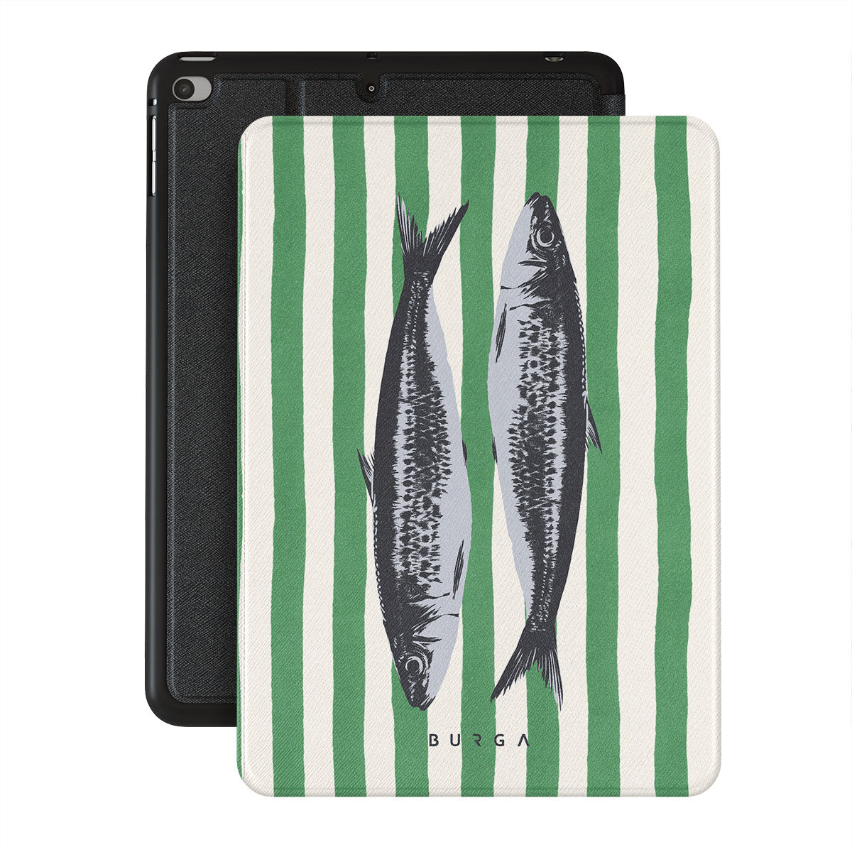 Główne elementy projektu: Sardynki, zielone paski, motywy oceaniczne.