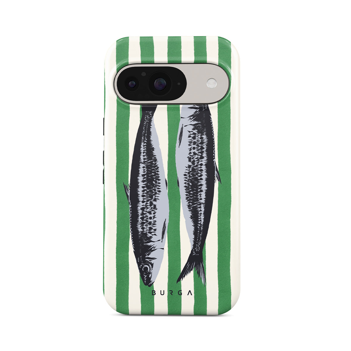 Główne elementy projektu: Sardynki, zielone paski, motywy oceaniczne.