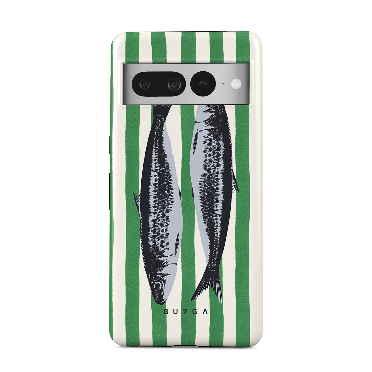 Główne elementy projektu: Sardynki, zielone paski, motywy oceaniczne.