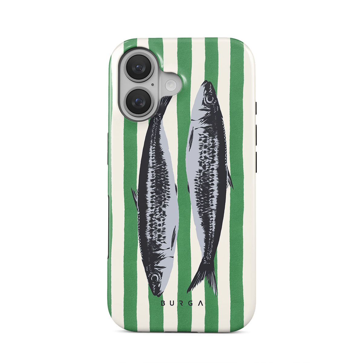 Główne elementy projektu: Sardynki, zielone paski, motywy oceaniczne.