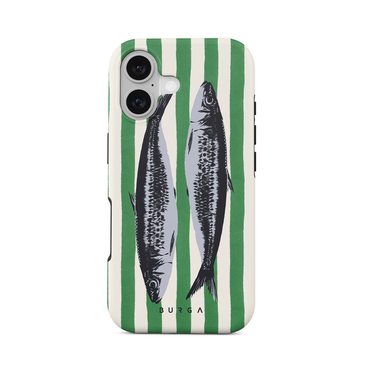 Główne elementy projektu: Sardynki, zielone paski, motywy oceaniczne.