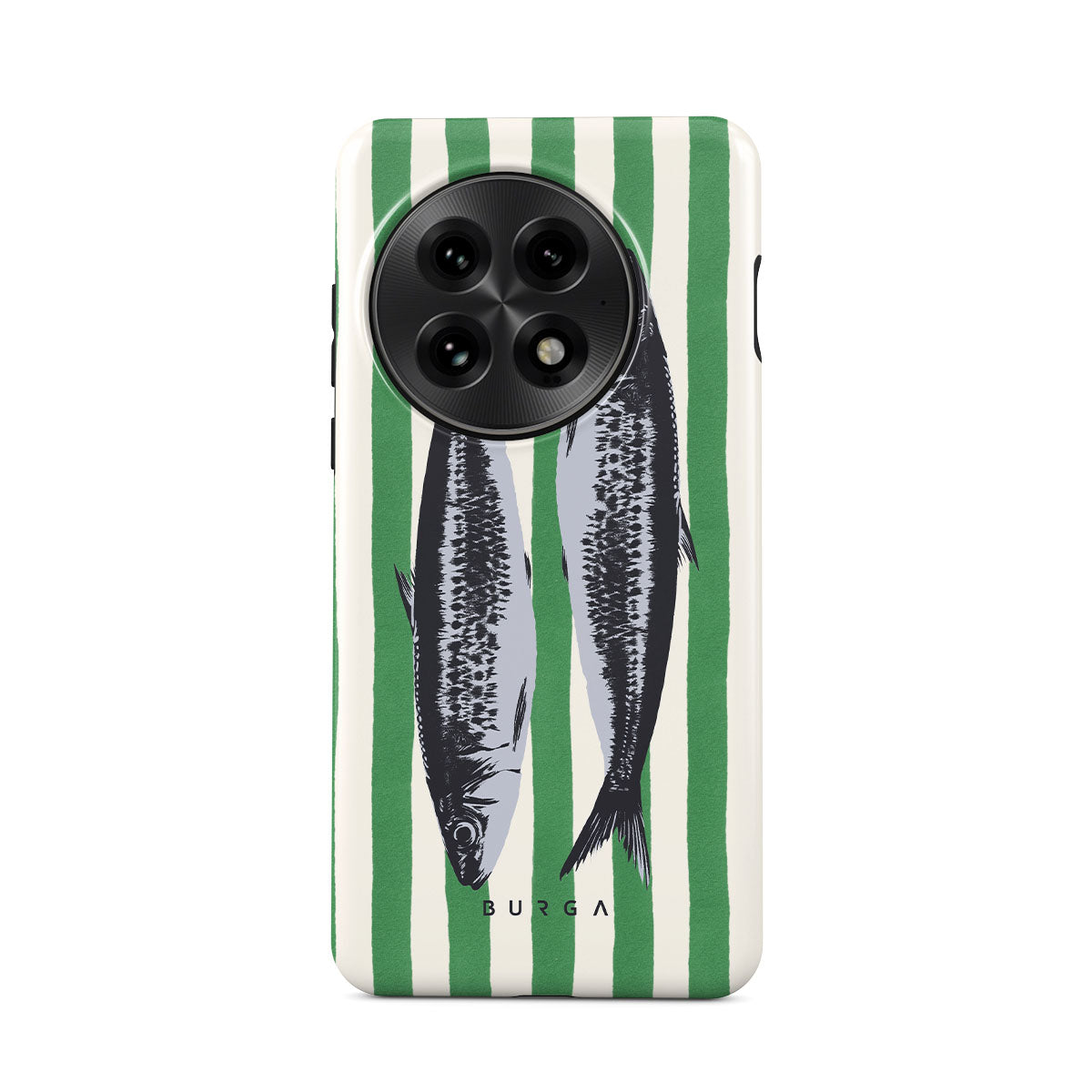 Główne elementy projektu: Sardynki, zielone paski, motywy oceaniczne.