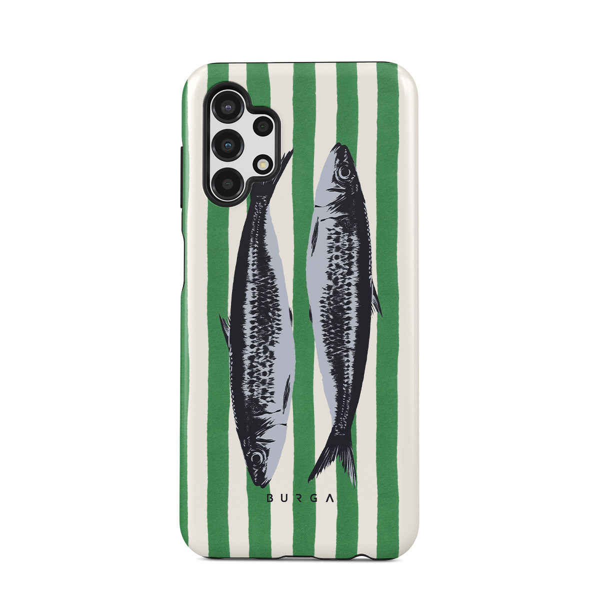 Główne elementy projektu: Sardynki, zielone paski, motywy oceaniczne.