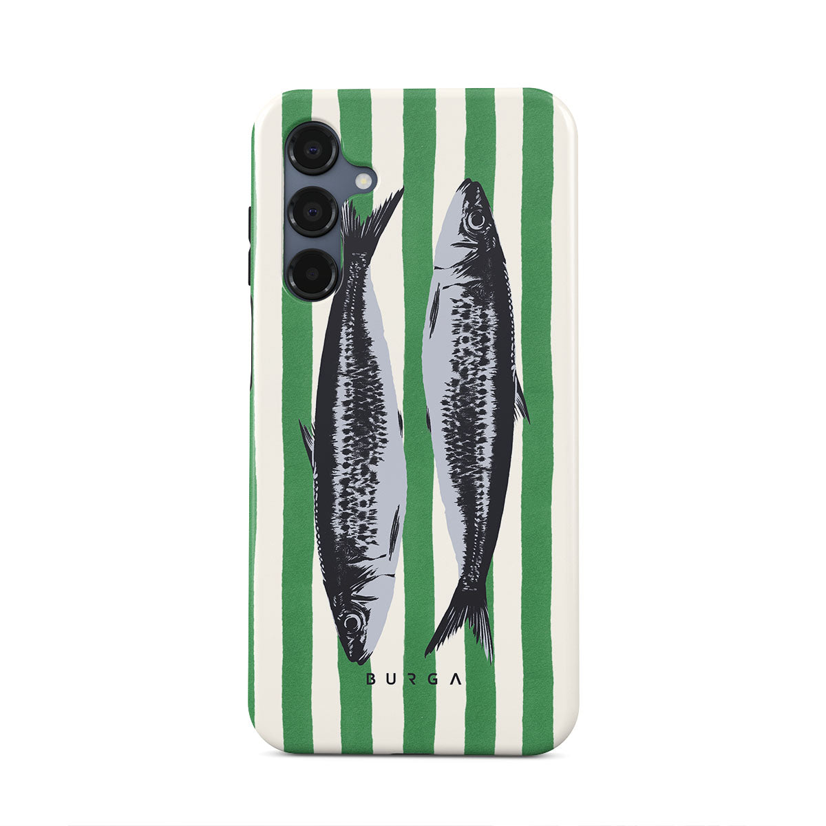 Główne elementy projektu: Sardynki, zielone paski, motywy oceaniczne.