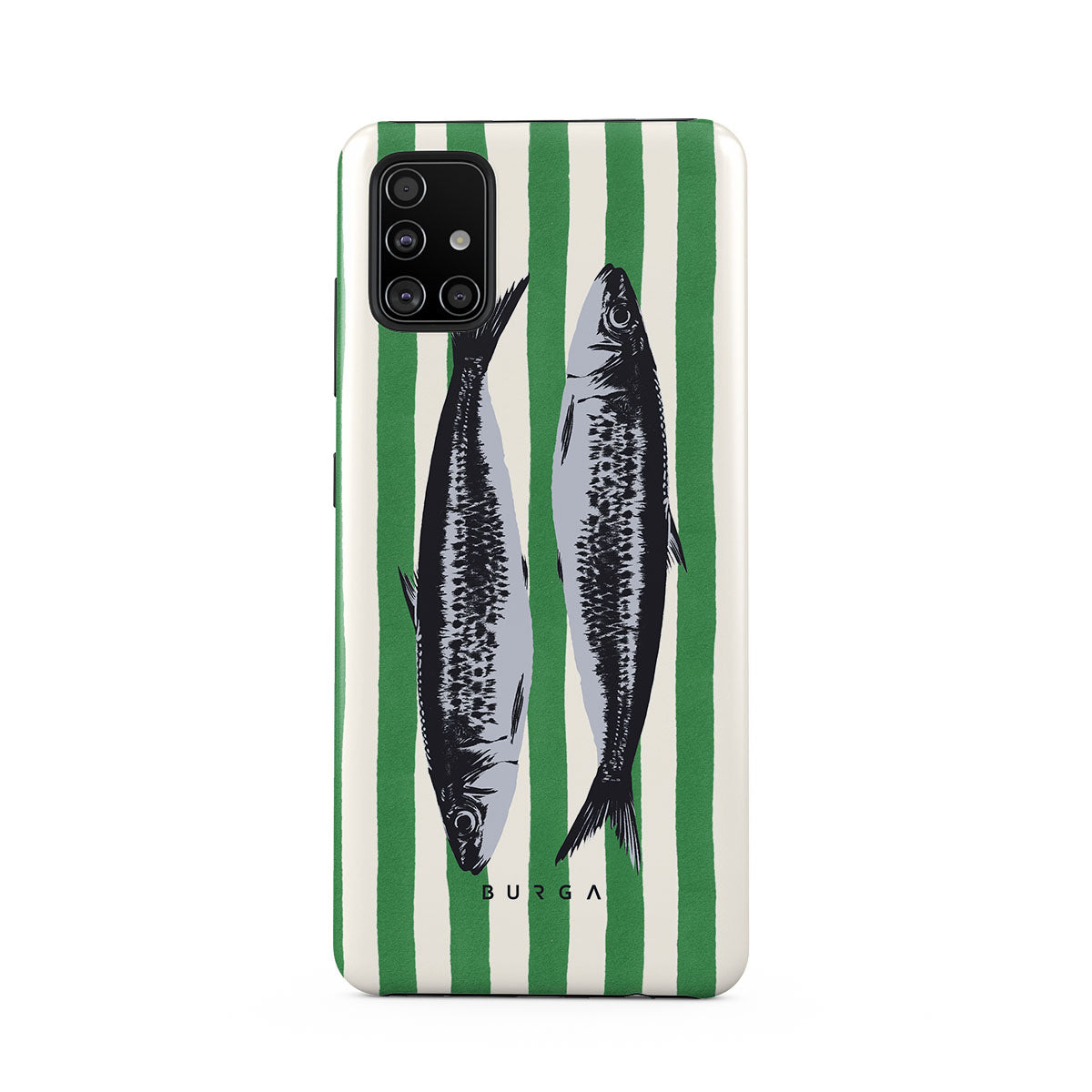 Główne elementy projektu: Sardynki, zielone paski, motywy oceaniczne.