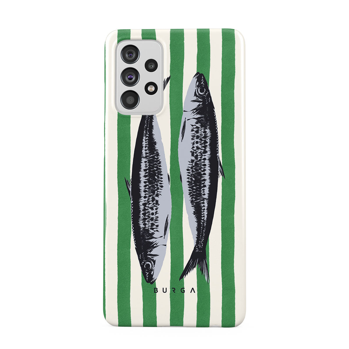 Główne elementy projektu: Sardynki, zielone paski, motywy oceaniczne.