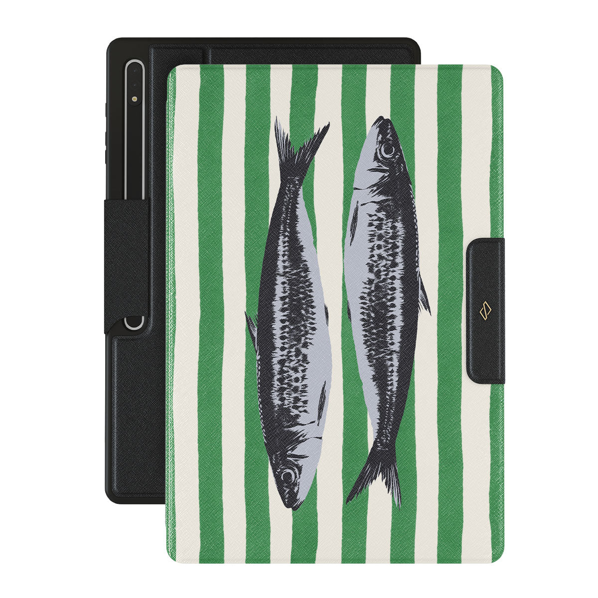 Główne elementy projektu: Sardynki, zielone paski, motywy oceaniczne.