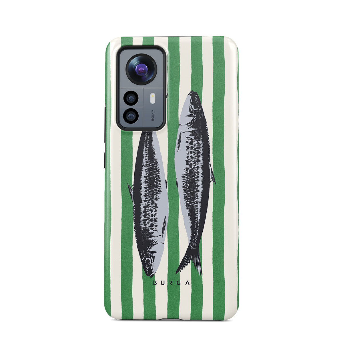 Główne elementy projektu: Sardynki, zielone paski, motywy oceaniczne.