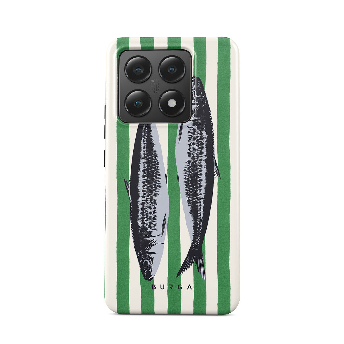 Główne elementy projektu: Sardynki, zielone paski, motywy oceaniczne.