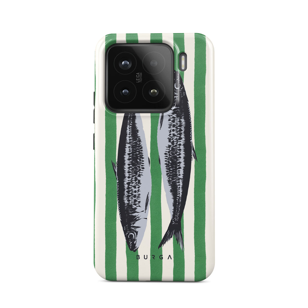 Główne elementy projektu: Sardynki, zielone paski, motywy oceaniczne.