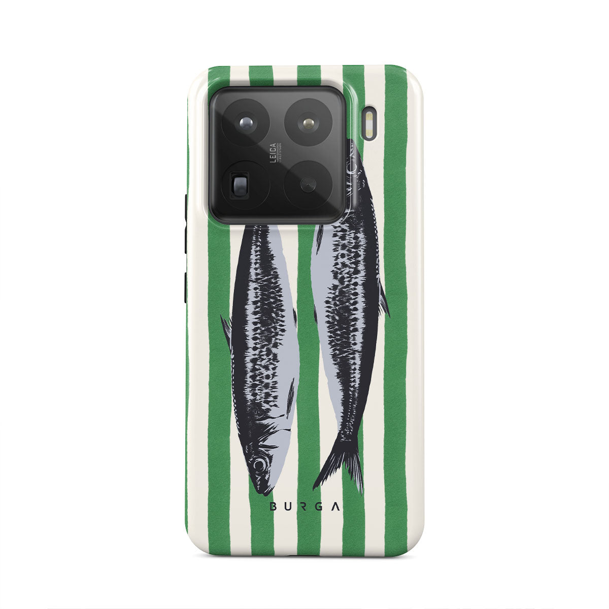 Główne elementy projektu: Sardynki, zielone paski, motywy oceaniczne.