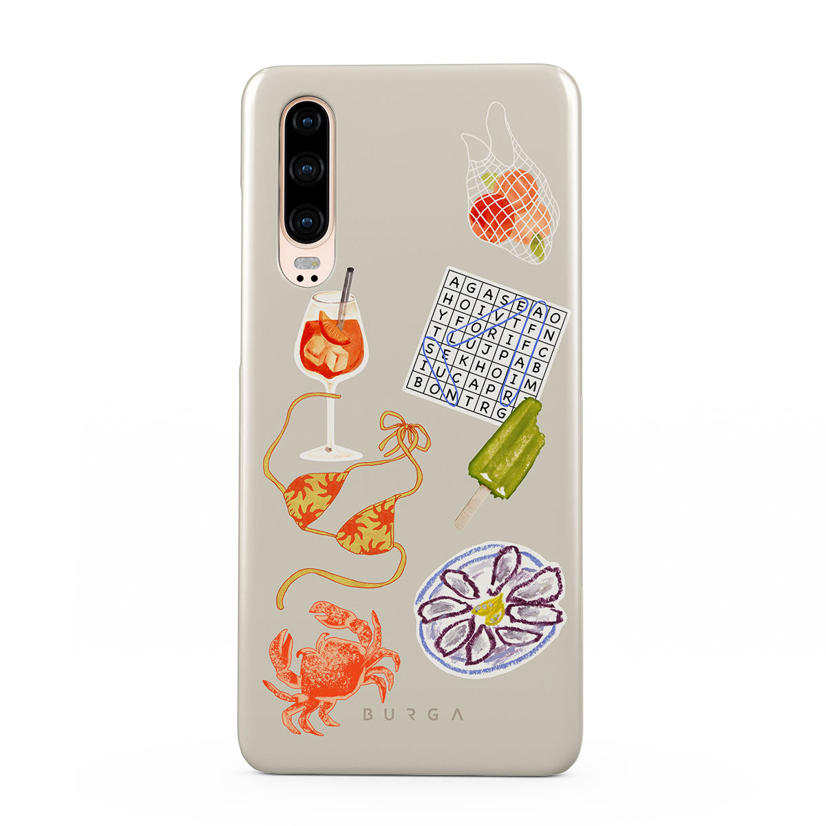 Główne elementy projektu: kraba, talerz ostryg, loda na patyku, krzyżówkę, koktajl spritz, górę od bikini, owoce.