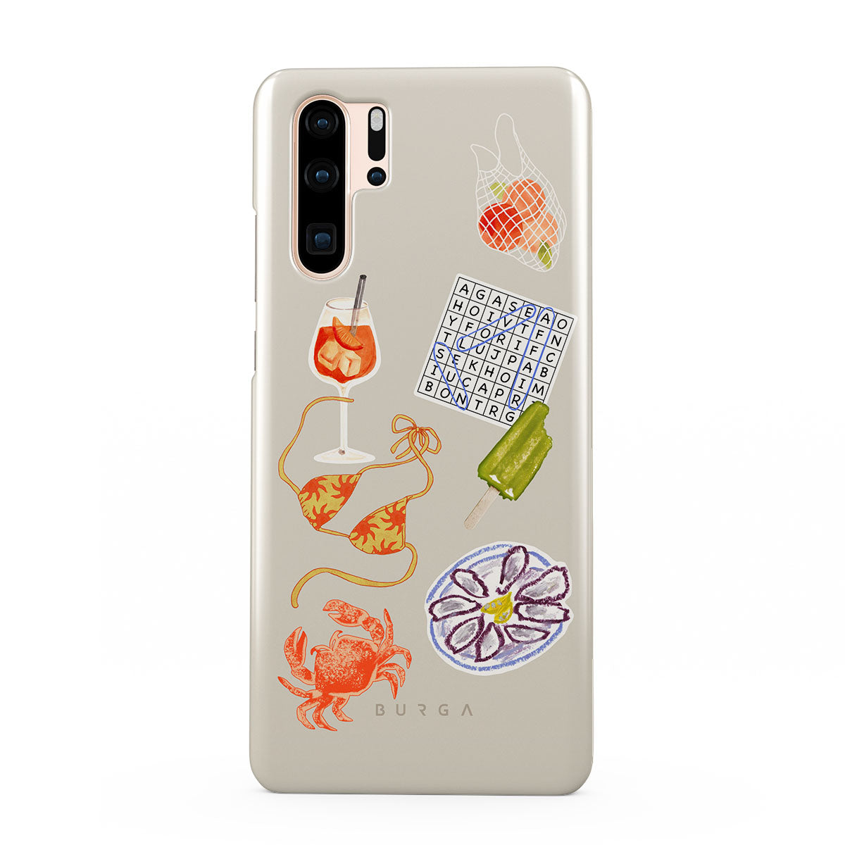 Główne elementy projektu: kraba, talerz ostryg, loda na patyku, krzyżówkę, koktajl spritz, górę od bikini, owoce.