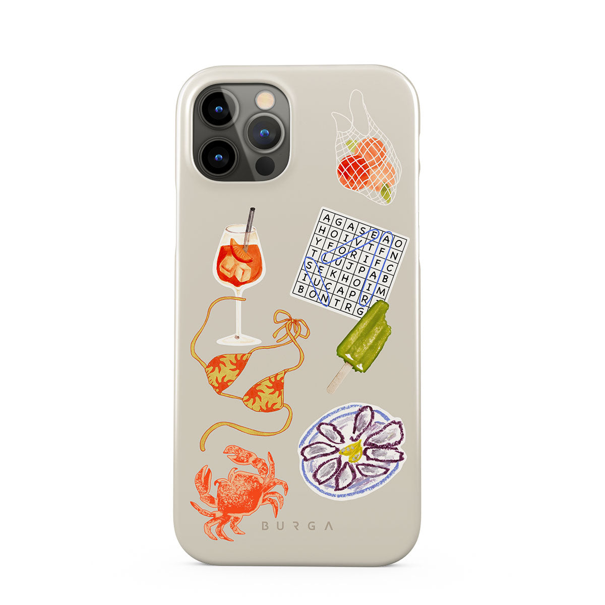 Główne elementy projektu: kraba, talerz ostryg, loda na patyku, krzyżówkę, koktajl spritz, górę od bikini, owoce.