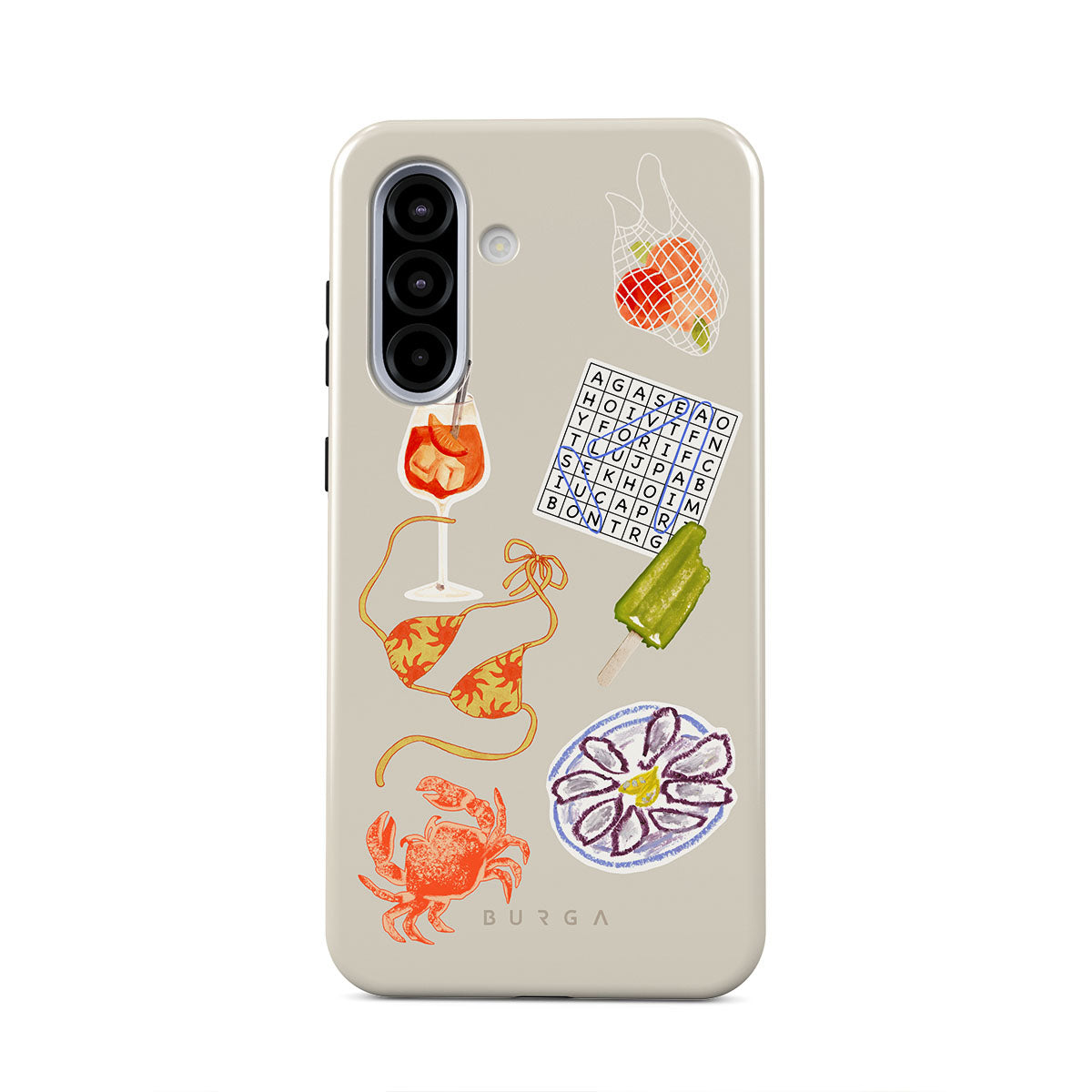 Główne elementy projektu: kraba, talerz ostryg, loda na patyku, krzyżówkę, koktajl spritz, górę od bikini, owoce.