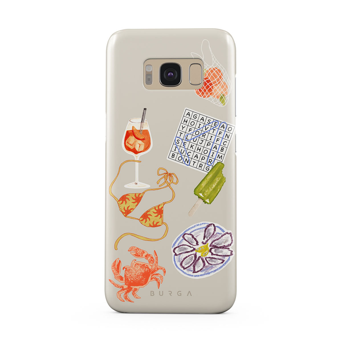 Główne elementy projektu: kraba, talerz ostryg, loda na patyku, krzyżówkę, koktajl spritz, górę od bikini, owoce.