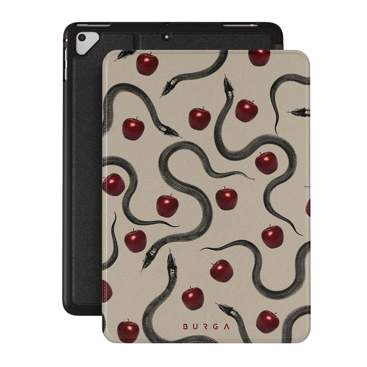 Główne elementy projektu: błyszczące czerwone jabłka, zwinięte węże, beżowe odcienie.