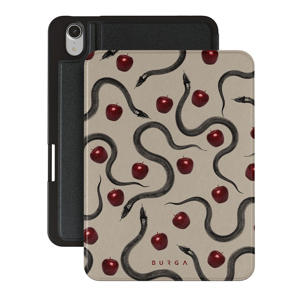 Główne elementy projektu: błyszczące czerwone jabłka, zwinięte węże, beżowe odcienie.