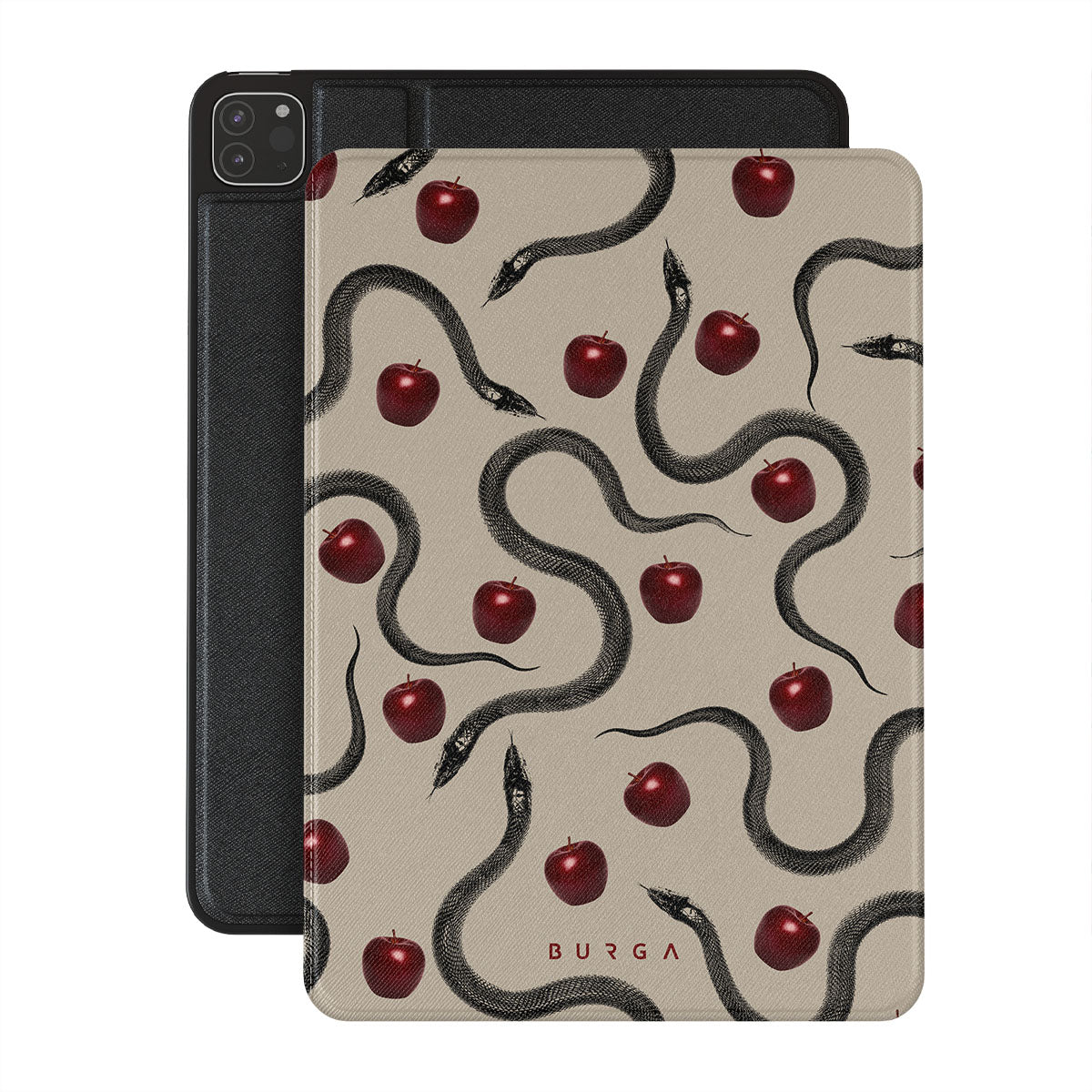 Główne elementy projektu: błyszczące czerwone jabłka, zwinięte węże, beżowe odcienie.