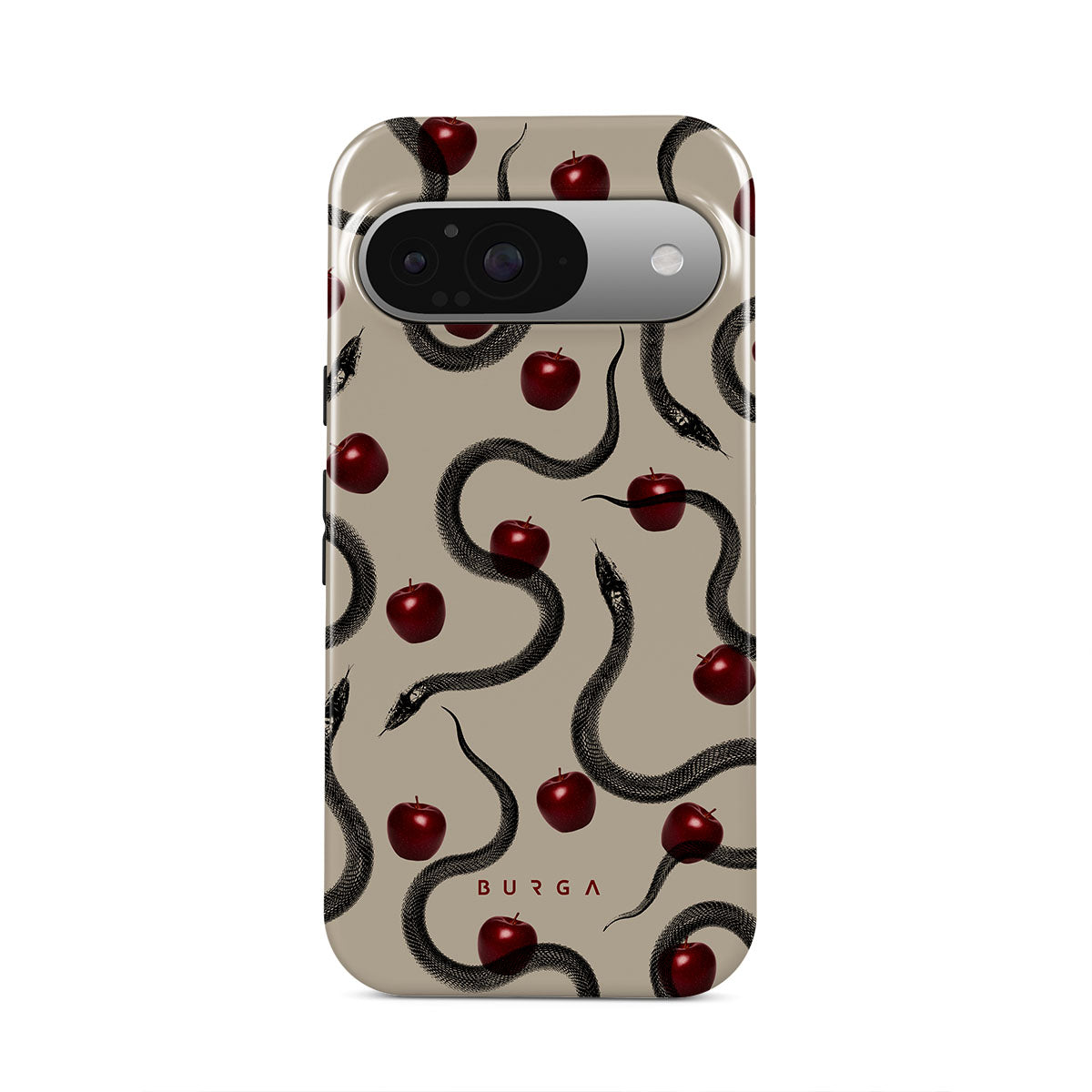 Główne elementy projektu: błyszczące czerwone jabłka, zwinięte węże, beżowe odcienie.