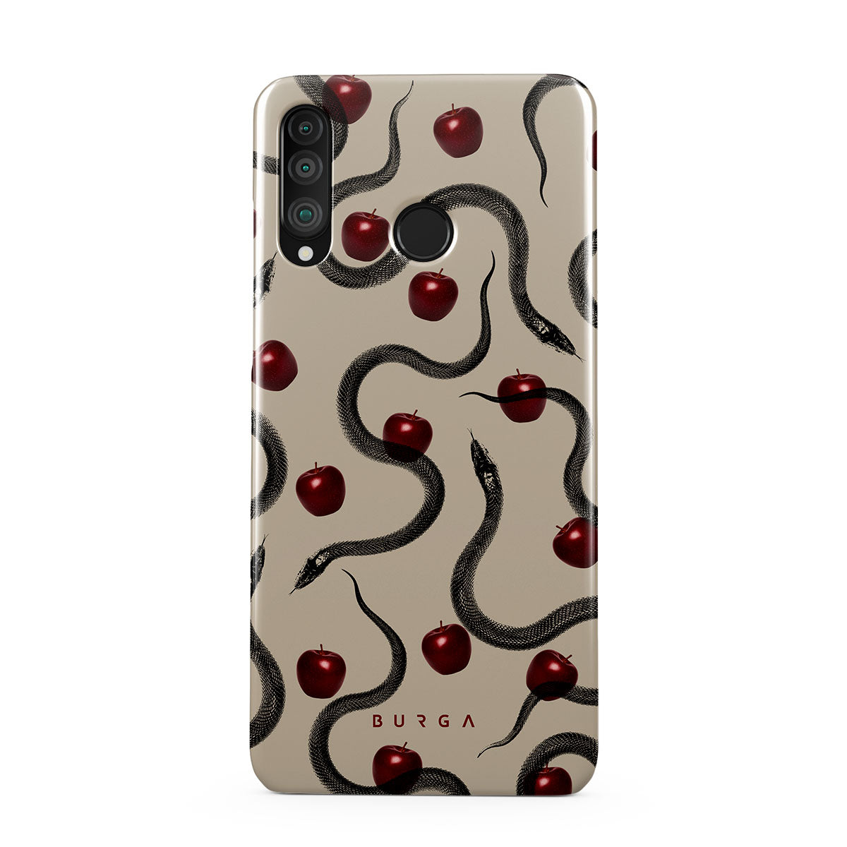 Główne elementy projektu: błyszczące czerwone jabłka, zwinięte węże, beżowe odcienie.
