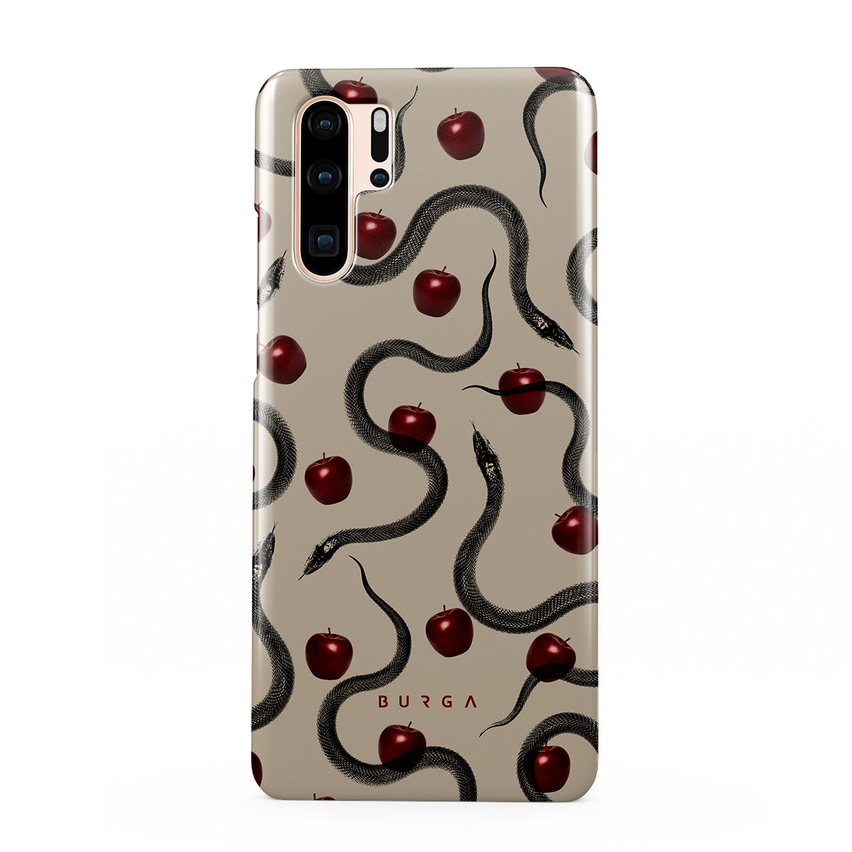 Główne elementy projektu: błyszczące czerwone jabłka, zwinięte węże, beżowe odcienie.