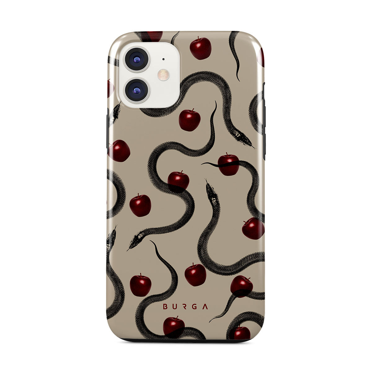 Główne elementy projektu: błyszczące czerwone jabłka, zwinięte węże, beżowe odcienie.