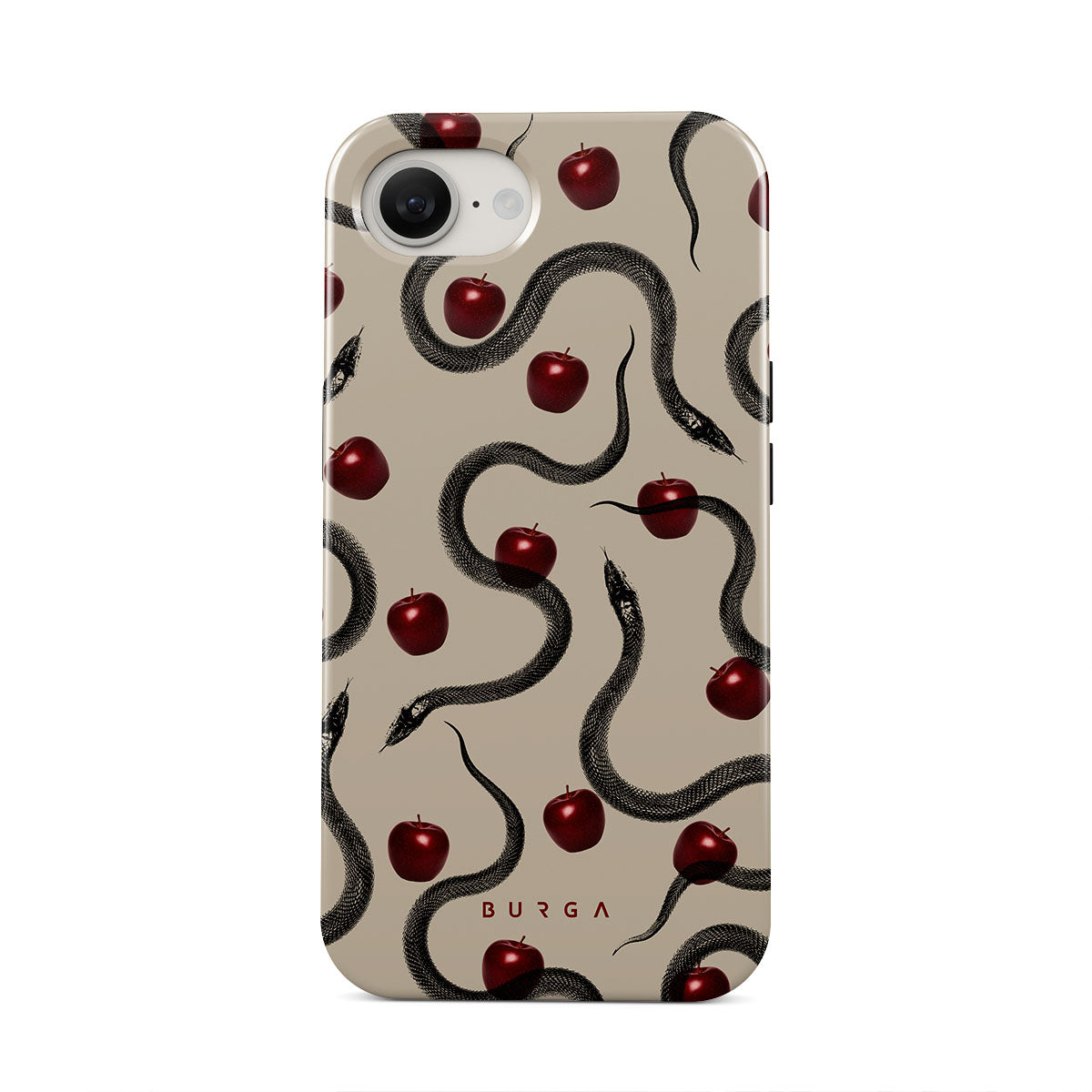 Główne elementy projektu: błyszczące czerwone jabłka, zwinięte węże, beżowe odcienie.