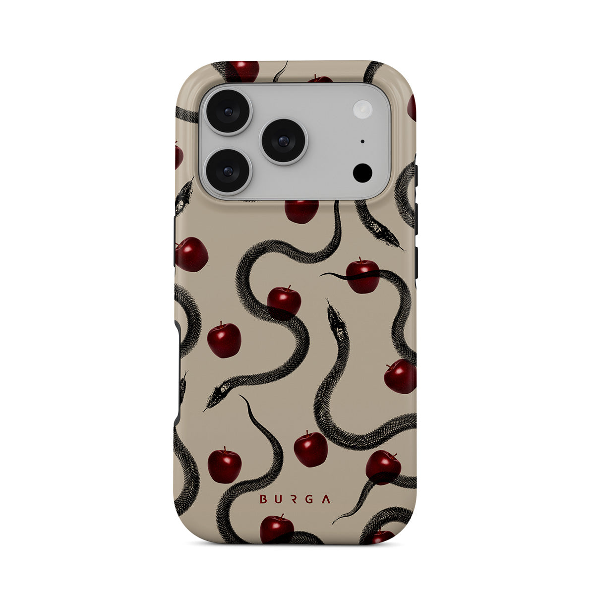 Główne elementy projektu: błyszczące czerwone jabłka, zwinięte węże, beżowe odcienie.