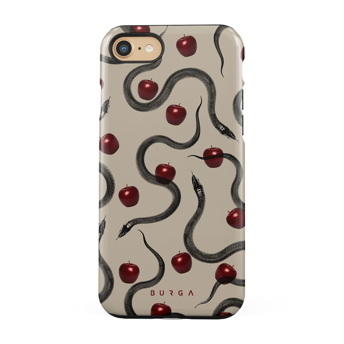 Główne elementy projektu: błyszczące czerwone jabłka, zwinięte węże, beżowe odcienie.