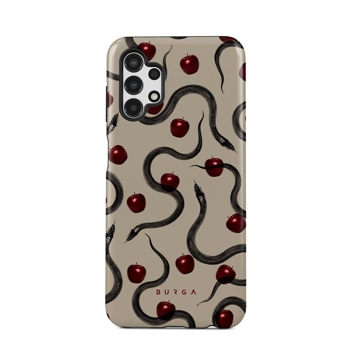 Główne elementy projektu: błyszczące czerwone jabłka, zwinięte węże, beżowe odcienie.