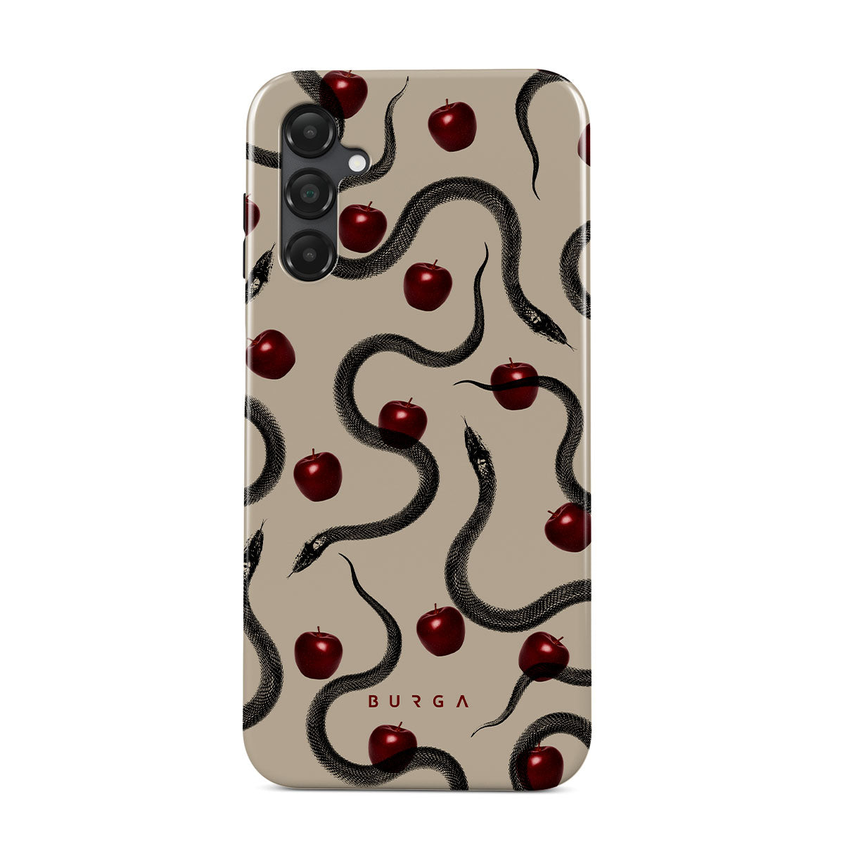 Główne elementy projektu: błyszczące czerwone jabłka, zwinięte węże, beżowe odcienie.