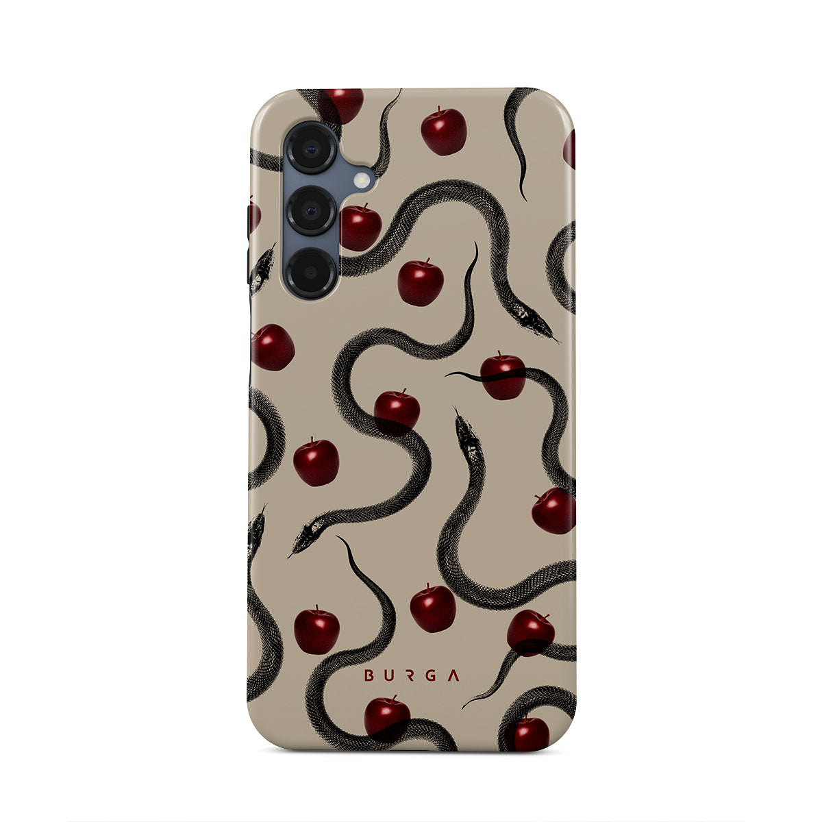 Główne elementy projektu: błyszczące czerwone jabłka, zwinięte węże, beżowe odcienie.