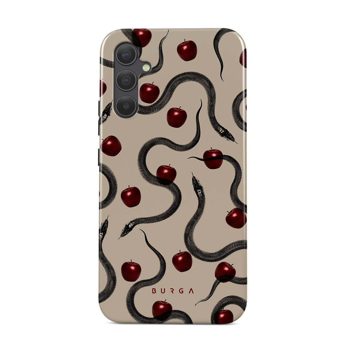 Główne elementy projektu: błyszczące czerwone jabłka, zwinięte węże, beżowe odcienie.