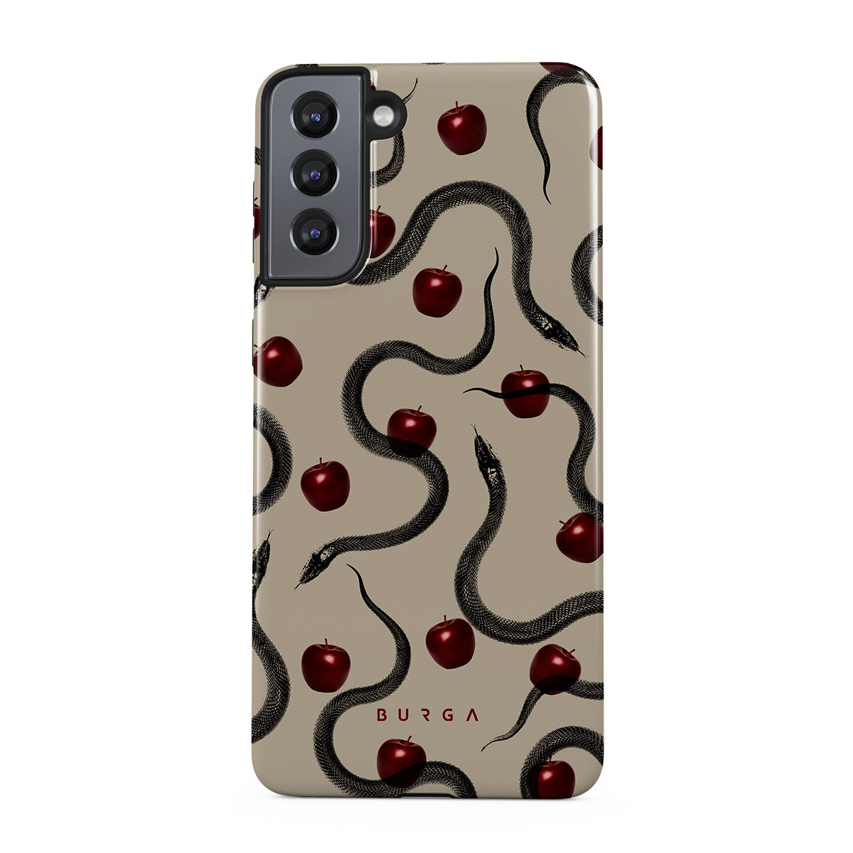 Główne elementy projektu: błyszczące czerwone jabłka, zwinięte węże, beżowe odcienie.