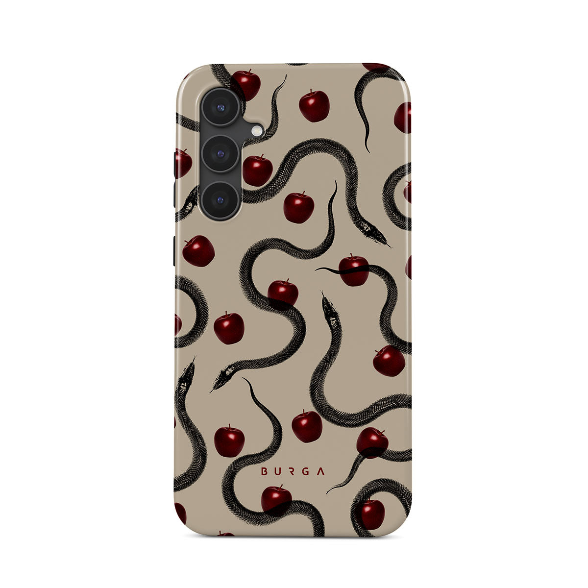 Główne elementy projektu: błyszczące czerwone jabłka, zwinięte węże, beżowe odcienie.