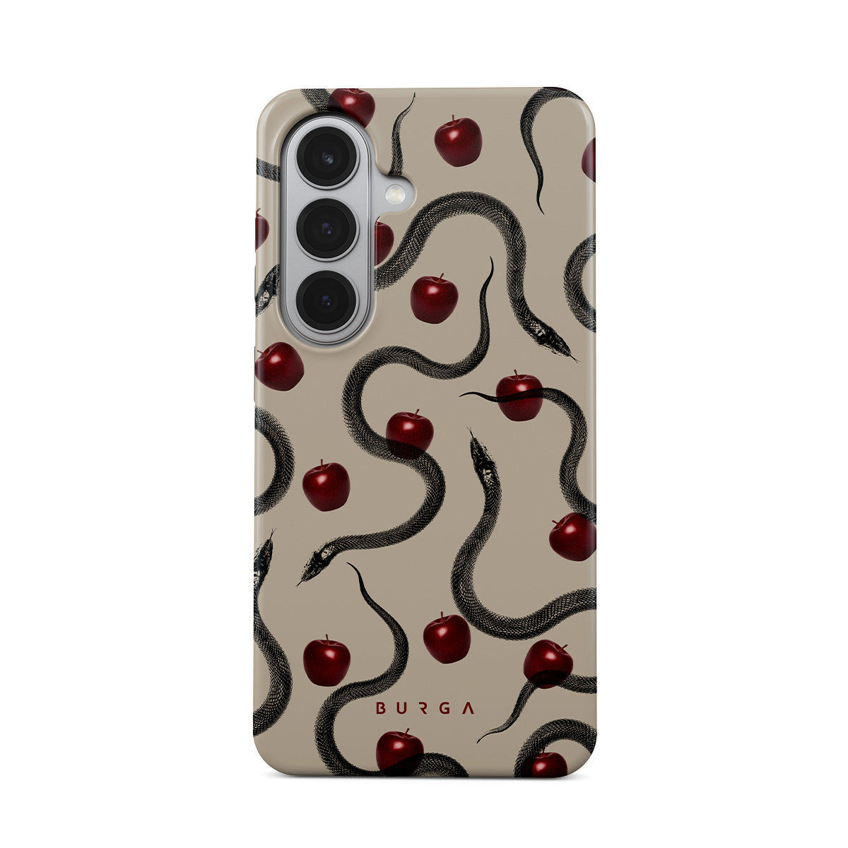 Główne elementy projektu: błyszczące czerwone jabłka, zwinięte węże, beżowe odcienie.